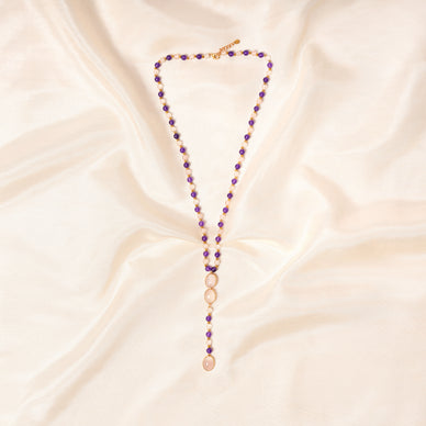 A modern reinterpretation of the classic rosary, the Soul Path Lariat Necklace combines elegance with intention. Featuring a delicate lariat design, this piece is adorned with luminous amethyst and soft rose quartz, symbolizing spiritual insight and the heart’s devotion. Perfect for layering or wearing solo, it’s a statement of love, balance, and modern sophistication.